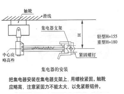 當滑觸線及配套件安裝完成后,即可以安裝集電器,按照高度尺寸H(支架中心到滑靴上平面的高度)。和觸靴端中心略高一些的要求,確定集電器支架在移動方向上的安裝位置。如圖: